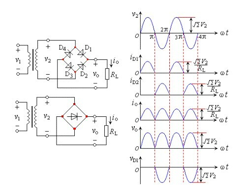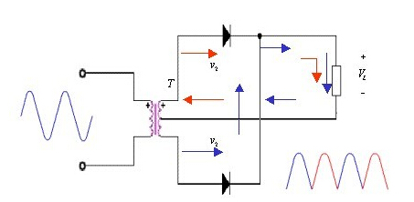 全波整流電路:利用副邊有中心抽頭的變壓器和兩個二極管構(gòu)成如下圖所示的全波整流電路,從圖中可見,正負半周都有電流流過負載,提高了整流效率。
