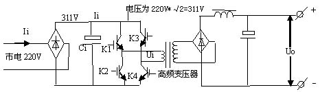 由電路可以看出,市電經(jīng)整流濾波后變?yōu)?11V高壓,經(jīng)K1~K4功率開關(guān)管有序工作后,變?yōu)槊}沖信號加至高頻變壓器的初級,脈沖的高度始終為311V。當(dāng)K1,K4開通時,311V高壓電流經(jīng)K1正向流入主變壓器初級,經(jīng)K4流出,在變壓器初級形成一個正向脈沖,同理,當(dāng)K2,K3開通時,311V高壓電流經(jīng)K3反向流入主變壓器初級,經(jīng)K2流出,在變壓器初級形成一個反向脈沖。這樣,在變壓器次級就形成一系列正反向脈沖,經(jīng)整流濾波后形成直流電壓。當(dāng)輸出電壓Uo較高時,脈沖寬度就寬,當(dāng)輸出電壓Uo較低時,脈沖寬度就窄,因此開關(guān)管實際上是一個控制脈沖寬窄的裝置。
